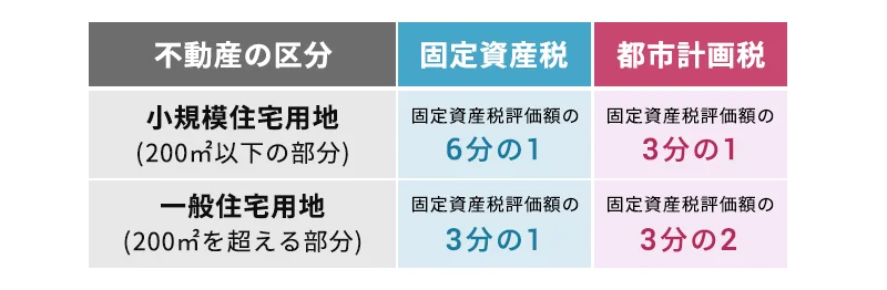 土地の面積が200㎡以下と、200㎡超で軽減率が分かれるようになっています。